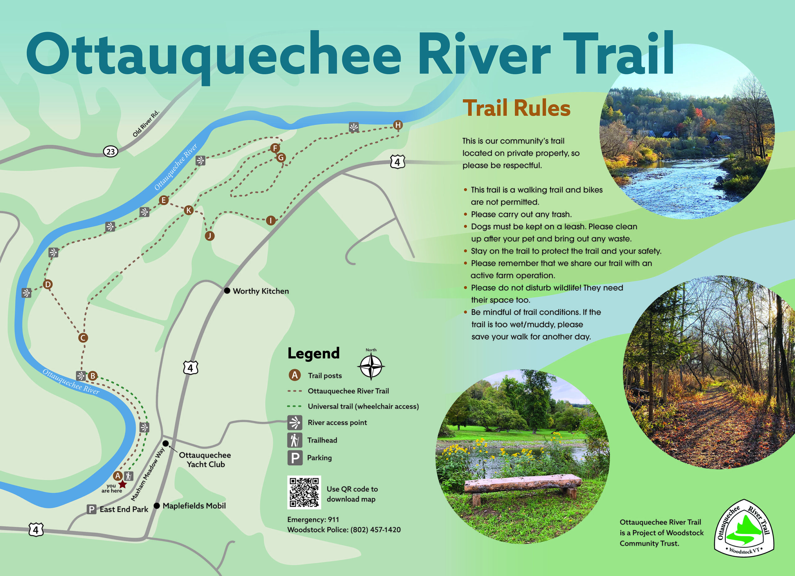 The Ottauquechee River Trail is a project of the Woodstock Community Trust, which is a nonprofit 501(c)(3) organization. You can download the trail map here.